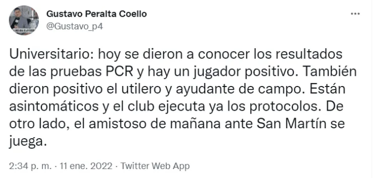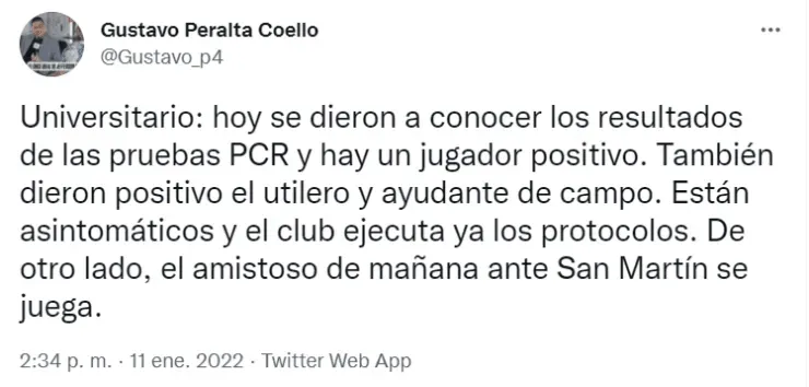 “Hoy se dieron a conocer los resultados de las pruebas PCR y hay un jugador positivo.También dieron positivo el utilero y ayudante de campo. Están asintomáticos y el club ejecuta ya los protocolos. De otro lado, el amistoso de mañana ante San Martín se juega”, informó el periodista de ESPN Perú.