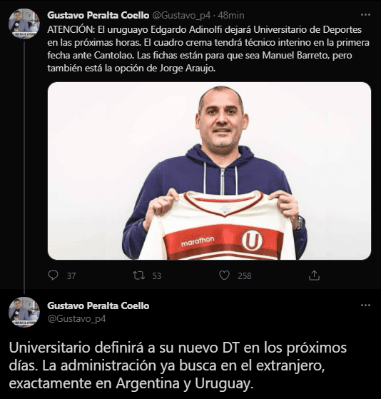 “ATENCIÓN: El uruguayo Edgardo Adinolfi dejará Universitario de Deportes en las próximas horas. El cuadro crema tendrá técnico interino en la primera fecha ante Cantolao. Las fichas están para que sea Manuel Barreto, pero también está la opción de Jorge Araujo”. Así mismo, el mismo comunicador social, comentó que están trabajando en el reemplazo.