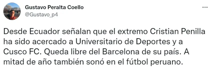 “Desde Ecuador señalan que el extremo Cristian Penilla ha sido acercado a Universitario de Deportes y a Cusco FC. Queda libre del Barcelona de su país. A mitad de año también sonó en el fútbol peruano”, precisó el periodista digital en su cuenta de Twitter.