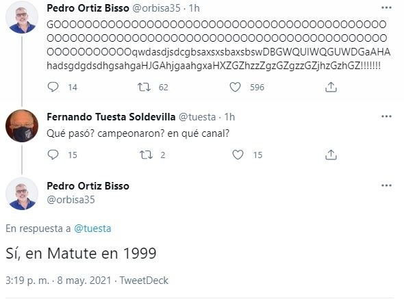 El mensaje tuvo respuesta en el ex jefe de la ONPE y confeso hincha de Alianza Lima, Fernando Tuesta, quien escribió: “Qué pasó? campeonaron? en qué canal?”. No pasó mucho tiempo para que Ortiz respondiera: “Sí, en Matute en 1999”.