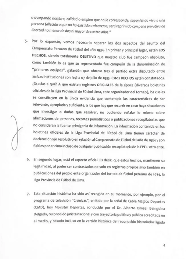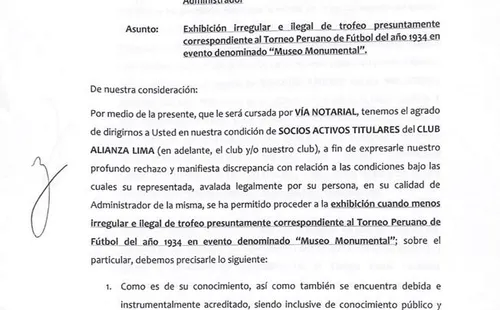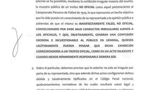 “Hemos cursado una carta notarial a Universitario de Deportes, con atención a Jean Ferrari, donde les solicitamos retirar el trofeo que irregularmente se exhibe como el del campeonato de 1934 en su museo, por no corresponder con la realidad”, se lee en el documento.