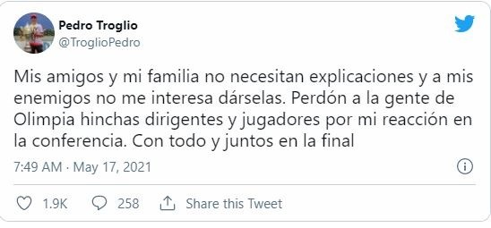Un día después de las fuertes declaraciones, Pedro pidió disculpas mediante un mensaje en su cuenta de Twitter.