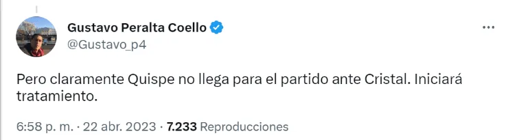 Resulta que el periodista Gustavo Peralta informó sobre una baja en el equipo merengue: “Piero Quispe hoy no pudo entrenar con normalidad en la U. El volante sintió mucho dolor y pasó pruebas médicas. Todo hace indicar que tendría un esguince de segundo grado en la rodilla izquierda”