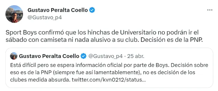 “Sport Boys confirmó que los hinchas de Universitario no podrán ir el sábado con camiseta ni nada alusivo a su club. Decisión es de la PNP”, se leen a través de las redes sociales del periodista deportivo.