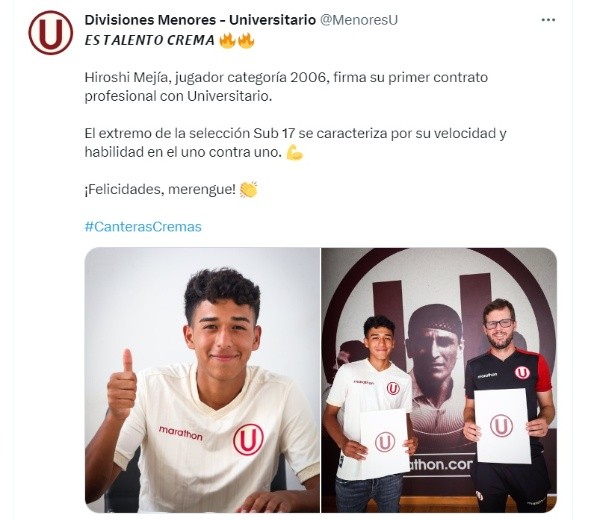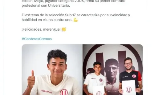 “Es talento crema. Hiroshi Mejía, jugador categoría 2006, firma su primer contrato profesional con Universitario. El extremo de la Selección Peruana Sub 17 se caracteriza por su velocidad y habilidad en el uno contra uno. ¡Felicidades, merengue!”, colocó el cuadro de Universitario de Deportes en sus redes sociales.