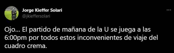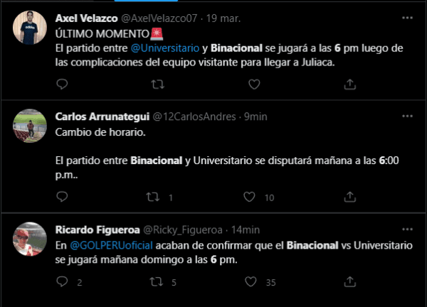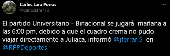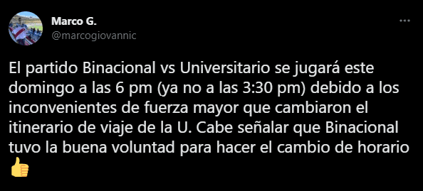 “El partido Binacional vs. Universitario se jugará este domingo a las 6 pm (ya no a las 3:30 pm) debido a los inconvenientes de fuerza mayor que cambiaron el itinerario de viaje de la U. Cabe señalar que Binacional tuvo la buena voluntad para hacer el cambio de horario”. Enhorabuena por las directivas que comprendieron la situación. Así da gusto de ver el deporte rey, donde no existe el ventajismo.