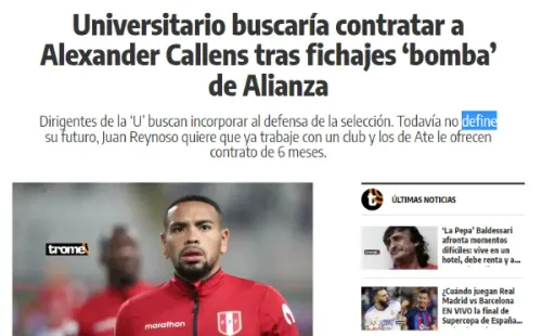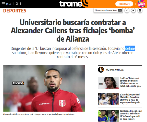Menciona el popular medio de comunicación lo siguiente: “Todo partió del interior de la Videna, el profesor Juan Reynoso, entrenador de la selección peruana, expresó su preocupación al saber qué pasan los días y el defensa central Alexander Callens sigue sin encontrar equipo. Lo considera un hombre importante en su proyecto con la ‘Blanquirroja’, sabe que el tiempo pasa y en un par de meses ya estarían dando inicio a las eliminatorias y hay que recuperar el tiempo que se está perdiendo”.