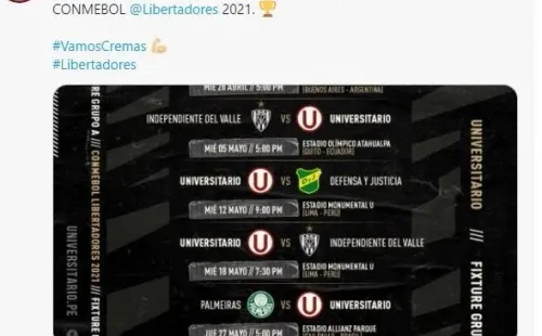 El debut de Universitario en la Copa Libertadores será el miércoles 21 de abril frente a Palmeiras, vigente campeón de la Copa Libertadores que llega de perder ante Defensa y Justicia la Recopa Sudamericana.