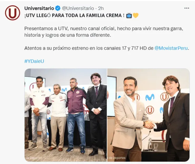 Universitario de Deportes y Movistar Deportes,anunciaron este viernes el lanzamiento oficial de ‘UTV’, el nuevo canal exclusivo del equipo merengue, el cual tendráuna programación extendida y dedicada para los hinchas cremas. De esta manera, al mismo estilo de los grandes equipos como Real Madrid o AC Milan, la ‘U’ se convierte en el primer equipo peruano que contará con su propio canal de TV.