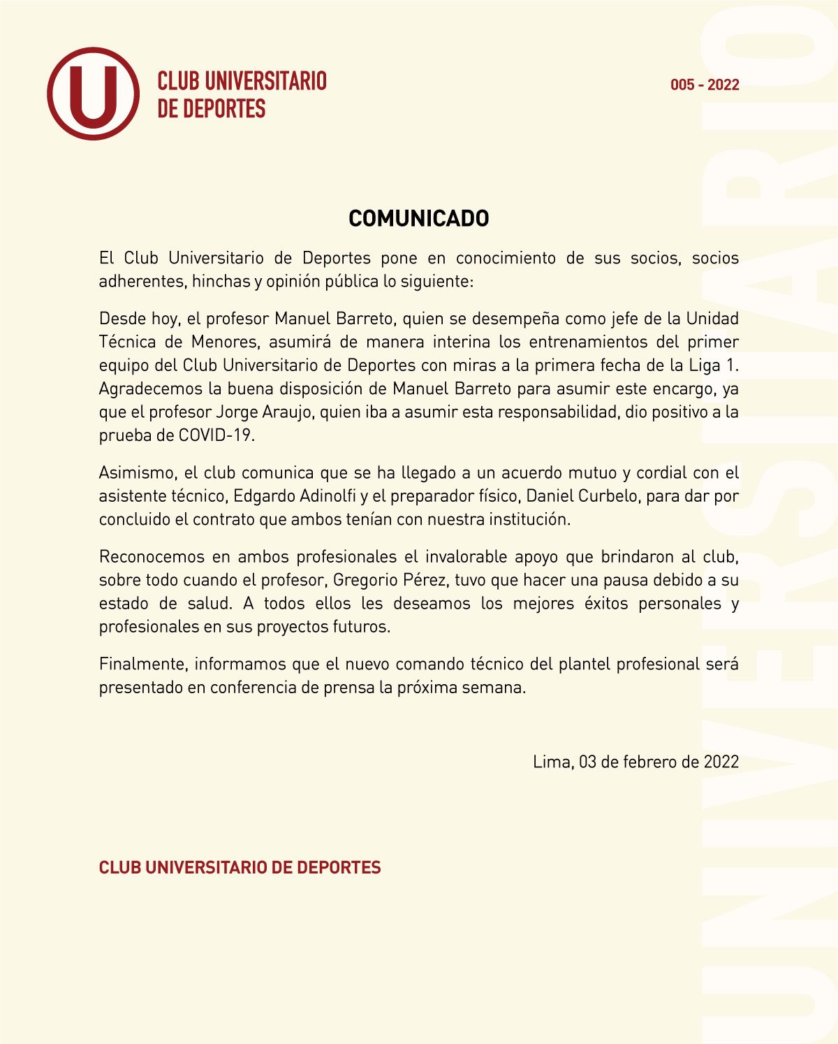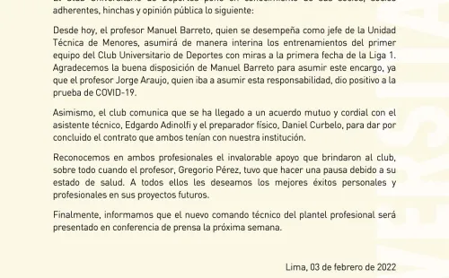 “Desde hoy, el profesor Manuel Barreto, quien se desempeña como jefe de la Unidad Técnica de Menores, asumirá de manera interina en los entrenamientos del primer equipo del Club Universitario de Deportes con miras a la primera fecha de la Liga 1“, comunicó a tráves de sus redes sociales el club este jueves temprano.