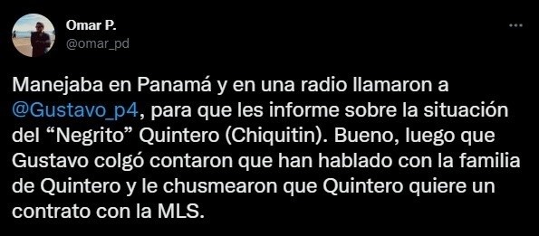 Resumiendo, lo siguiente en su cuenta de Twitter, donde colocó: “Manejaba en Panamá y en una radio llamaron a Gustavo Peralta, para que les informe sobre la situación del “Negrito” Quintero (Chiquitín). Bueno, luego que Gustavo colgó, contaron que han hablado con la familia de Quintero y le chusmearon que Quintero quiere un contrato con la MLS”. Entonces, no perdió el tiempo y encendió la grabadora.