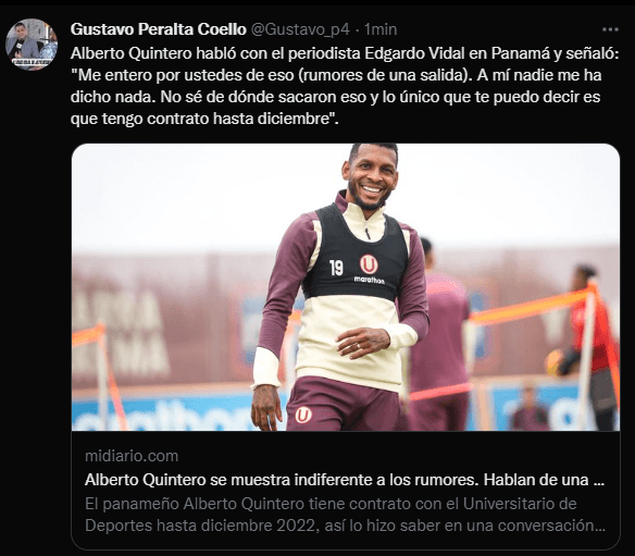 Textualmente, esto presenta en las redes sociales, el comunicador social de ESPN: “Alberto Quintero habló con el periodista Edgardo Vidal en Panamá y señaló: “Me entero por ustedes de eso (rumores de una salida). A mí nadie me ha dicho nada. No sé de dónde sacaron eso y lo único que te puedo decir es que tengo contrato hasta diciembre””. Quizás ahora las cosas cambian, porque él no quiere irse, como se mencionó recientemente. Los hinchas opinarán.