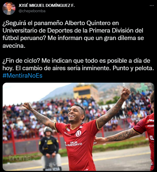 “¿Seguirá el panameño Alberto Quintero en Universitario de Deportes de la Primera División del fútbol peruano? Me informan que un gran dilema se avecina”. Fue la primera parte de su información, generando revuelo dentro del ambiente deportivo. Para después ir un poco más adelante.