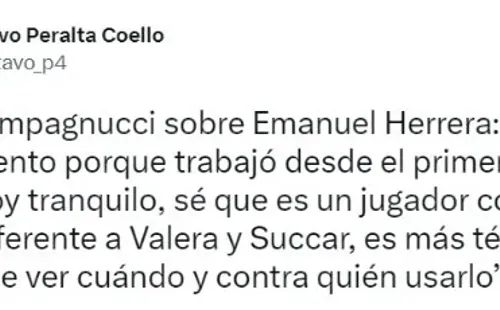 “Estoy muy contento porque trabajó desde el primer día que llegó. Estoy tranquilo, sé que es un jugador confiable”, precisó Carlos Compagnucci en conferencia de prensa. Siguiendo con su alocución, el técnico también brindó las virtudes de Emanuel Herrera respecto a Alex Valera y Alexander Succar.