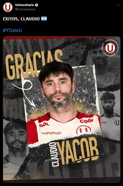 Universitario de Deportes anunció la salida oficial del volante argentino, Claudio Yacob, con el que llegó a un acuerdo para la rescisión de su contrato que acababa a fines de 2023. Anunciando en las redes sociales su salida, sin mucho cariño, con respeto, pero con poco afecto general.
