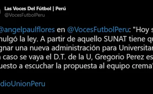 El periodista Ángel Flores precisó lo siguiente en el programa radial: “Hoy se promulgó la ley. A partir de aquello SUNAT tiene que designar una nueva administración para Universitario. Si en caso se vaya el D.T. de la U, Gregorio Perez está dispuesto a escuchar la propuesta al equipo crema”.