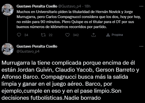 “Muchos en Universitario piden la titularidad de Hernán Novick y Jorge Murrugarra, pero Carlos Compagnucci considera que los dos, hoy por hoy, no están para 90 minutos. Piero Quispe es el titular para el DT por sus buenos números de kilómetros recorridos por partido”. Explicó en principio, para después señalar quienes están mejor actualmente que el ’10’ y el joven volante de marca.