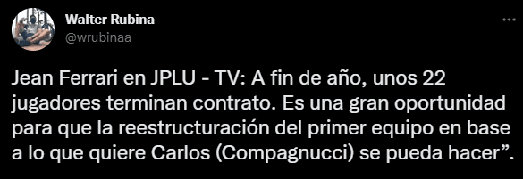 Esto dijo el encargado de la “U”, en esta larguísima conversación por redes sociales: “A fin de año, unos 22 jugadores terminan contrato. Es una gran oportunidad para que la reestructuración del primer equipo en base a lo que quiere Carlos (Compagnucci) se pueda hacer”.