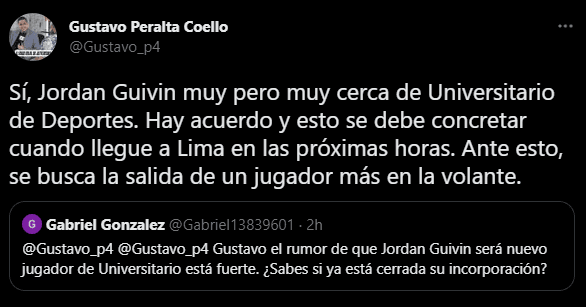 La información fue presentada por el periodista deportivo de ‘Infobae Perú’, Jean Pierre Maraví, quien contó este detalle en favor de los hinchas ‘merengues’: “Jordan Guivin al final se decidió por Universitario de Deportes. Acuerdo con Toros Celaya por un año con opción a compra de pase. La próxima semana vendrá a Lima”.