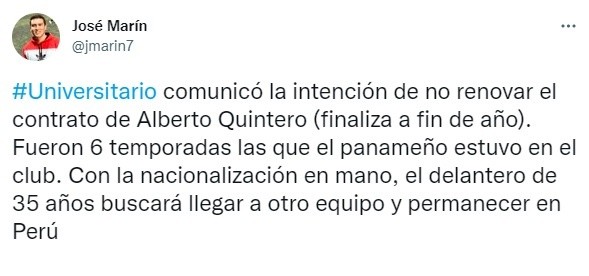 El panameño Alberto Quintero no seguirá en Universitario, el club no tuvo la intención de no renovarle contrato, a pesar de que el delantero contaba con la nacionalización peruana y a sus 35 años buscará llegar a otro club y permanecer en el país.