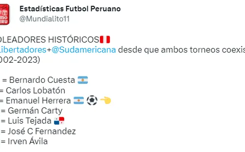 “GOLEADORES HISTÓRICOS” Libertadores + Sudamericana desde que ambos torneos coexisten (2002-2023). 20 = Bernardo Cuesta (argentino), 11 = Carlos Lobatón, 11 = Emanuel Herrera (argentino),10 = Germán Carty, 10 = Luis Tejada (panameño), 10 = José C Fernandez y 10 = Irven Ávila”, escribieron.