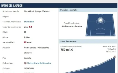 Tasado en 750 mil euros por la página Transfermarkt, el portal económico deportivo evaluó a Piero Quispe y si bien no llegó al millón de dólares, tranquilamente durante las negociaciones podría alcanzar ese valora.