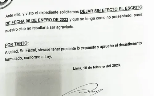 “Solicitamos dejar sin efecto el escrito de fecha 06 de enero 2023 y que se tenga como no presentado, pues nuestro club resultaría no ser agraviado. Por tanto, a usted, Sr. Fiscal, sírvase tener presente lo expuesto y apruebe el desistimiento formulado, conforme a Ley”, remarcó.