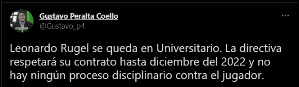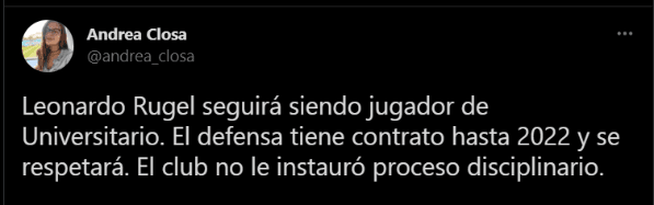 “Leonardo Rugel se queda en Universitario. La directiva respetará su contrato hasta diciembre del 2022 y no hay ningún proceso disciplinario contra el jugador”. Precisó Peralta, algo semejante también propuso Closa.
