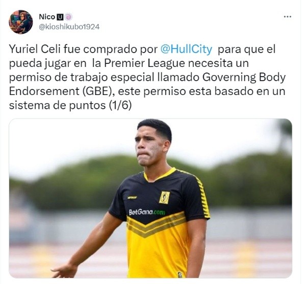 “Yuriel Celi fue comprado por Hull City y para que él pueda jugar en la Championship necesita un permiso de trabajo especial llamado Governing Body Endorsement (GBE), este permiso esta basado en un sistema de puntos (1/6)”, explica al detalle el usuario.