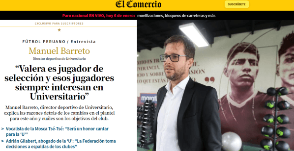 Manuel Barreto, en la nota, se le pregunta por la posibilidad de sumar al delantero mostrado al mundo en el Deportivo Llacuabamba: “En este mercado no me he referido a ningún jugador, eso no va a cambiar. Lo que sí puedo decirte que Alex es un jugador de élite del fútbol peruano, de Selección y esos jugadores siempre interesan a Universitario”.