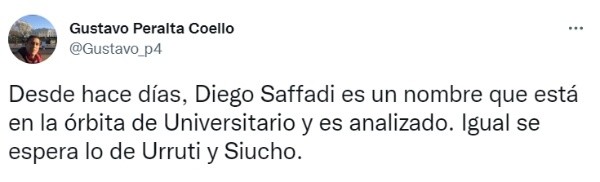 “Desde hace días, Diego Saffadi es un nombre que está en la órbita de Universitario y es analizado. Igual se espera lo de Urruti y Siucho”, comentó en su cuenta personal de Twitter el periodista Gustavo Peralta.