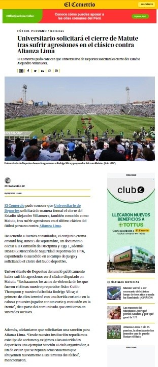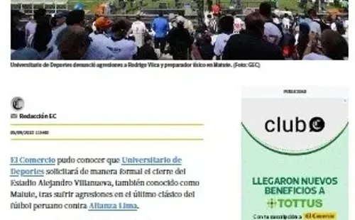 Expuesta por el Diario El Comercio, el medio reveló que Universitario solicitará el cierre del estadio Alejandro Villanueva, Matute, luego del clásico del fútbol peruano. Con base en las agresiones físicas y verbales, desde la dirigencia preparan un documento irrefutable.