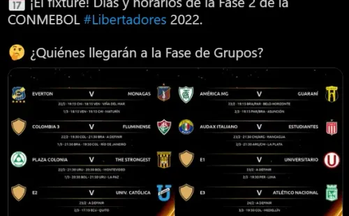 “¡El fixture! Días y horarios de la Fase 2 de la CONMEBOL #Libertadores 2022. ¿Quiénes llegarán a la Fase de Grupos?”. Fue lo que mencionó la CONMEBOL Libertadores. En una de sus gráficas se puede ver lo que mencionamos, el duelo de ‘los cremas’ ante ‘E1’ (aún por confirmar).