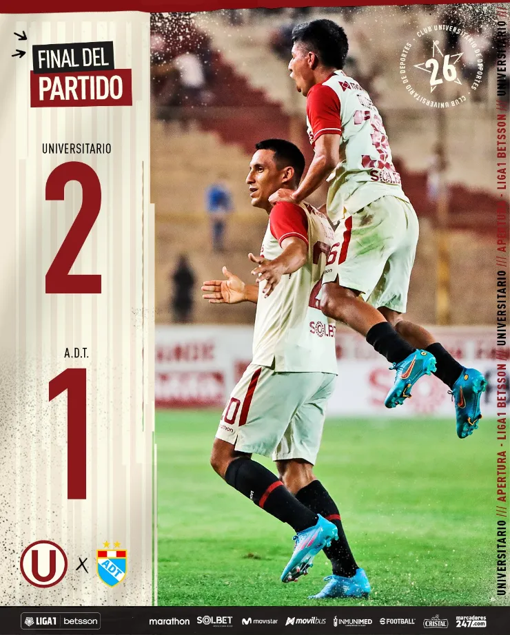 Universitario de Deportes venció 2-1 al ADT de Tarma por la octava fecha de la Liga 1, en duelo disputado en el Estadio Monumental. Cabe resaltar que el equipo de Álvaro Gutiérrez empezó perdiendo el encuentro tras un tanto del conjunto visitante, por lo que en la segunda mitad tuvo que replantear el partido para conseguir darle vuelta al marcador y así cortar una mala racha de tres fechas sin conseguir un triunfo en el Torneo Apertura.