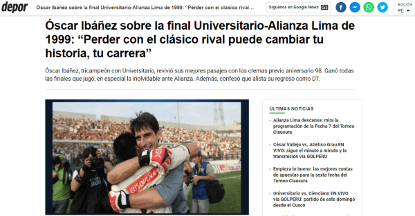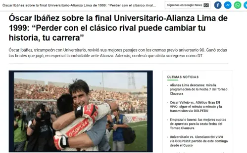 Muchos podrán decir que no es el momento de acordarse del rival eterno, pero en esta oportunidad lo sintió oportuno, y quién se puede negar a oírlo. Óscar Ibáñez, para muchos jóvenes, ha sido el mejor portero que defendió el arco de Universitario de Deportes durante mucho tiempo. Razones no le faltarán, por eso es considerado como un referente histórico.