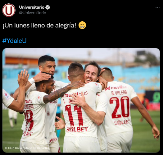 Mientras que, por su parte, Universitario de Deportes en su cuenta de Twitter, saludó este lunes temprano a sus seguidores: “¡Un lunes lleno de alegría! #YdaleU”. Desatando la locura de los usuarios, los cuales agradecieron la alegría generada el último domingo, por estar en la siguiente Copa Libertadores.