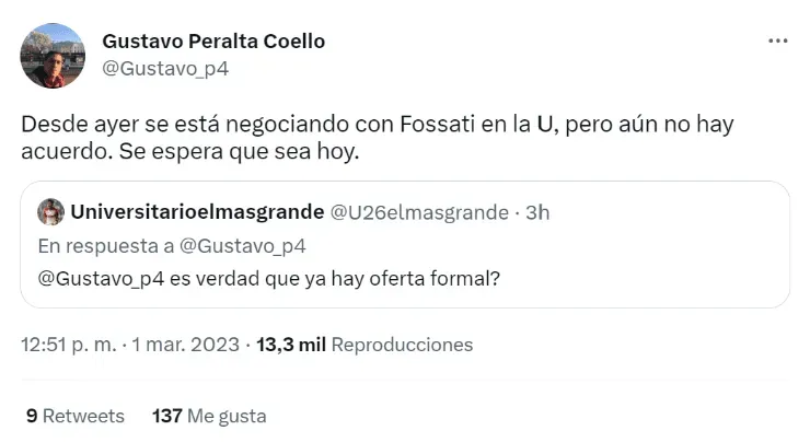 “No me gusta mentir. Sí, Universitario de Deportes se ha comunicado conmigo en las últimas horas, pero hasta ahora no hay nada concreto. Es lo único que voy a decir. Es un orgullo que me llame un club con la grandeza de la ‘U'”, expresó Fossatial ser consultado sobre si Universitario le hizo una oferta laboral.
