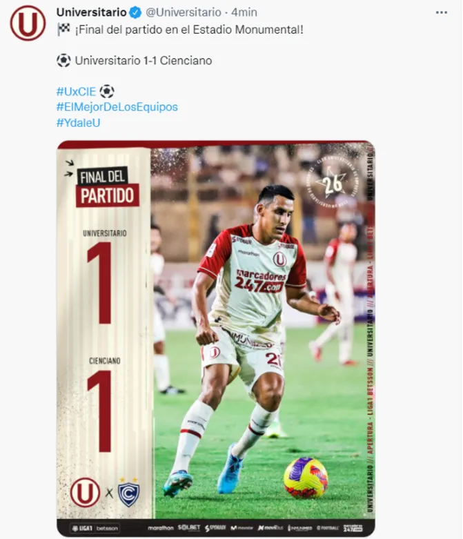 Universitario de Deportes empató 1-1 anteCienciano del Cuscocomo local en el Estadio Monumental, por la Fecha 6 de la temporada 2022 de la Liga 1.En este partido, Piero Guzmán (22 años), quien debutóen el primer equipo de Universitariotuvo sudebut soñado tras marcar el primer tantodel cuadro crema frente a la escuadra imperial.