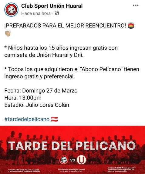 A través de las redes sociales, el cuadro del ‘Pelícano’ anunció este compromiso frente al equipo crema, donde también revelaron que niños hasta los 15 añospodrán ingresargratis con camiseta de Unión Huaral y su DNI. En cuanto a las personas que adquirieron el“Abono Pelícano” tienen ingreso gratis y preferencial para esta presentación y duelo ante la ‘U’.