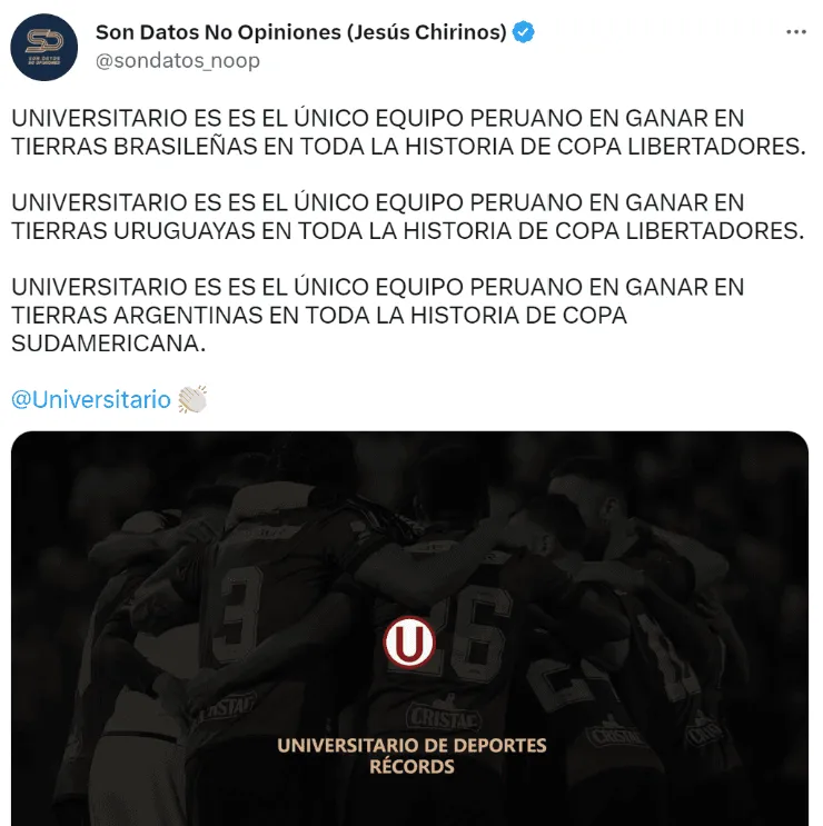Resulta que el portal estadístico “Son Datos y No Opiniones” dio a conocer que los merengues son el único equipo peruano en poder cosechar triunfos en Brasil, Uruguay y Argentina, siendo de los dos primeros países mencionados por Copa Libertadores y en tierras argentina por la Sudamericana.
