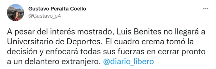 “A pesar del interés mostrado, Luis Benites no llegará a Universitario de Deportes. El cuadro crema tomó la decisión y enfocará todas sus fuerzas en cerrar pronto a un delantero extranjero”, reveló el periodista Gustavo Peralta en su cuenta de Twitter.