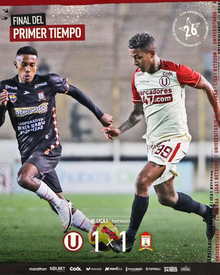 Por la novena fecha del Torneo Clausura de la Liga 1 Betsson, Universitario de Deportes iguala 1-1 ante Ayacucho FC en el Estadio Monumental. Aldair Salazar abrió la cuenta a los 25 minutos de cabeza, pero Federico Alonso empató a los 29. En el complemento, Alexander Succar (75′) puso el 2-1 para el triunfo parcial del cuadro de Compagnucci.