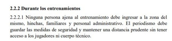 En uno de los puntos de los protocolos se indica: “Ninguna persona ajena al entrenamiento debe ingresar a la zona del mismo, hinchas, familiares y personal administrativo. El periodismo debe guardar las medidas de seguridad y mantener una distancia prudente sin tener acceso a los jugadores ni cuerpo técnico”.