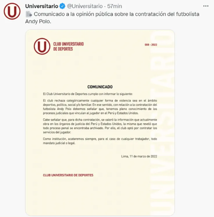 “El club rechaza categóricamente cualquier forma de violencia,sea en el ámbito deportivo, político, social y/o familiar. En ese sentido, con relación a la contratación del futbolista Andy Polo, debemos señalar que, tenemos conocimiento de los procesos judiciales que vinculan al jugador en el Perú y Estados Unidos”, dice el comunicado publicado en las redes sociales del club de Ate.