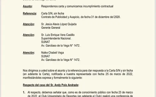Universitario de Deportes le respondió a la empresa AJEPER S.A., compañía que había decidió suspender la entrega de productos Sporadepor el caso de Andy Polo. Sin embargo, este viernes la institución crema afirmó, mediante un comunicado, que solo separarían al jugador si se presentan nuevas denuncias que lleven a sentencia por violencia familiar.