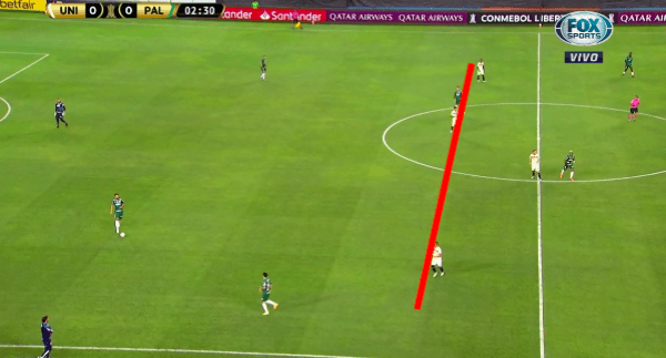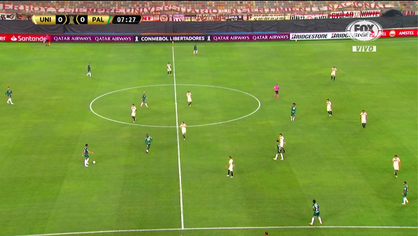 Resulta que los once futbolistas merengues están metidos en su zona defensiva, no pasan la mitad de cancha, y aguantan cada ataque de Palmeiras. Las imágenes que brindan la TV oficial de la Copa Libertadores, lo muestran claramente.