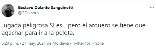 En las redes sociales también hubieron opiniones al respecto, todas críticas para el juez principal del duelo entre brasileños y merengues. Sin embargo, una voz fuerte fue la del ex Universitario; Gustavo Dulanto, quien en Twitter publicó lo siguiente.