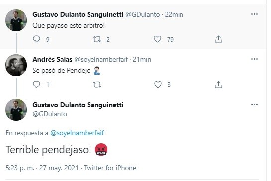 En una línea de tuits comentó lo siguiente. Primero fue: “Que payaso este árbitro”. Después pasó a responder el mensaje de un fanático así: “Terrible pendejaso”. Y ya un poco más calmado, expresó su opinión sobre la jugada: “Jugada peligrosa SI es… pero el arquero se tiene que agachar para ir a la pelota”. Muchos hinchas de la “U” se sentirán representado por el jugador del FC Sheriff Tiraspol.
