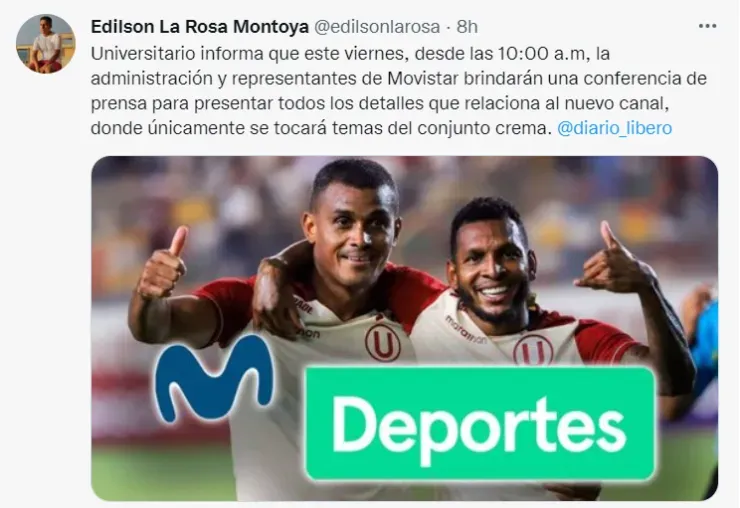 “Universitario informa que este viernes, desde las 10:00 a.m, la administración y representantes de Movistar brindarán una conferencia de prensa para presentar todos los detalles que relaciona al nuevo canal, donde únicamente se tocará temas del conjunto crema”, reveló el periodista del diario Líbero en su cuenta de Twitter.