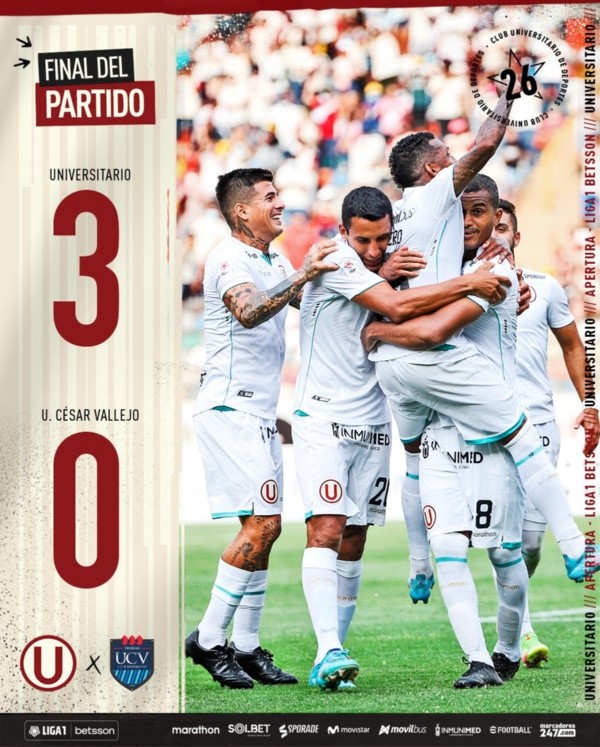 Universitario de Deportes se enfrentó a la Universidad César Vallejo por la fecha 4 del Torneo Apertura en la Liga 1, el partido se dio en el estadio Monumental. Los dirigidos por Álvaro Gutiérrez venían de perder por 2-0 frente a Barcelona SC por la Copa Libertadores. Esta vez los ‘cremas’ sumaron de a 3 para así no perderle el paso al primer lugar de la tabla que es Sport Huancayo.